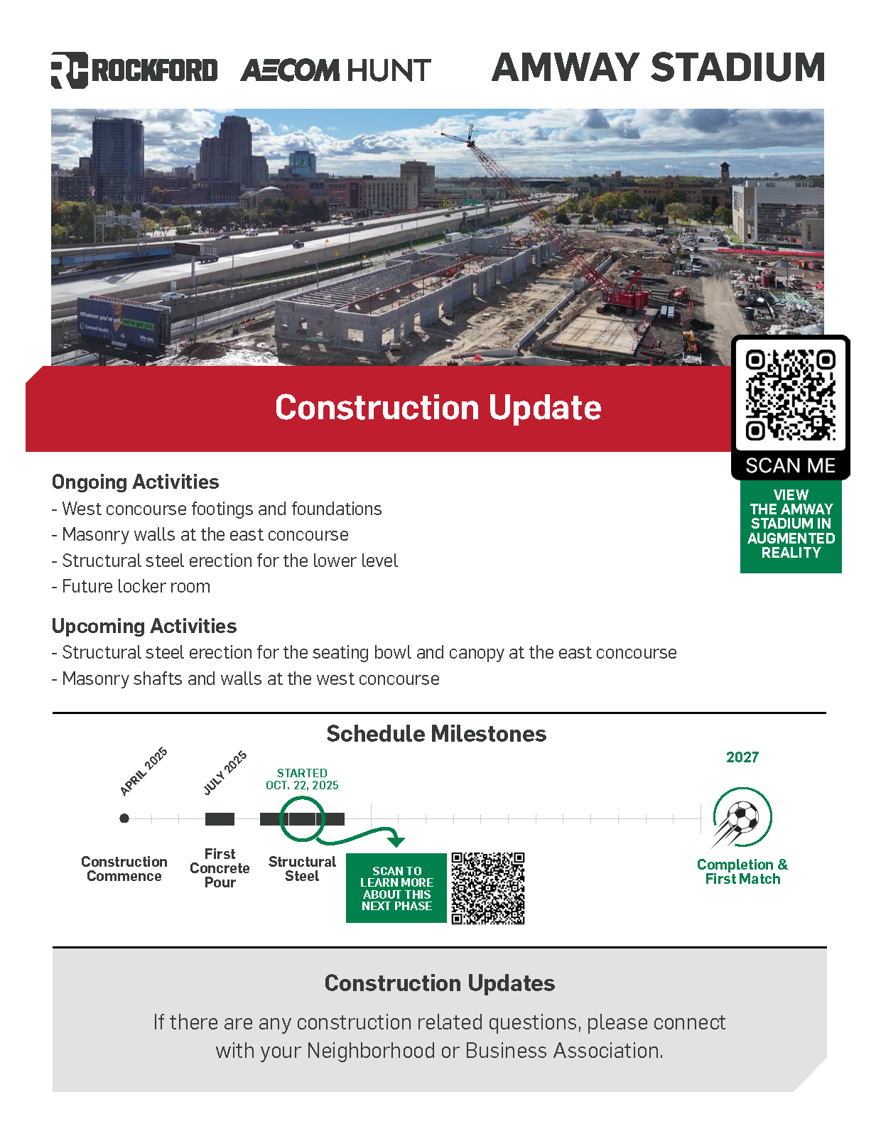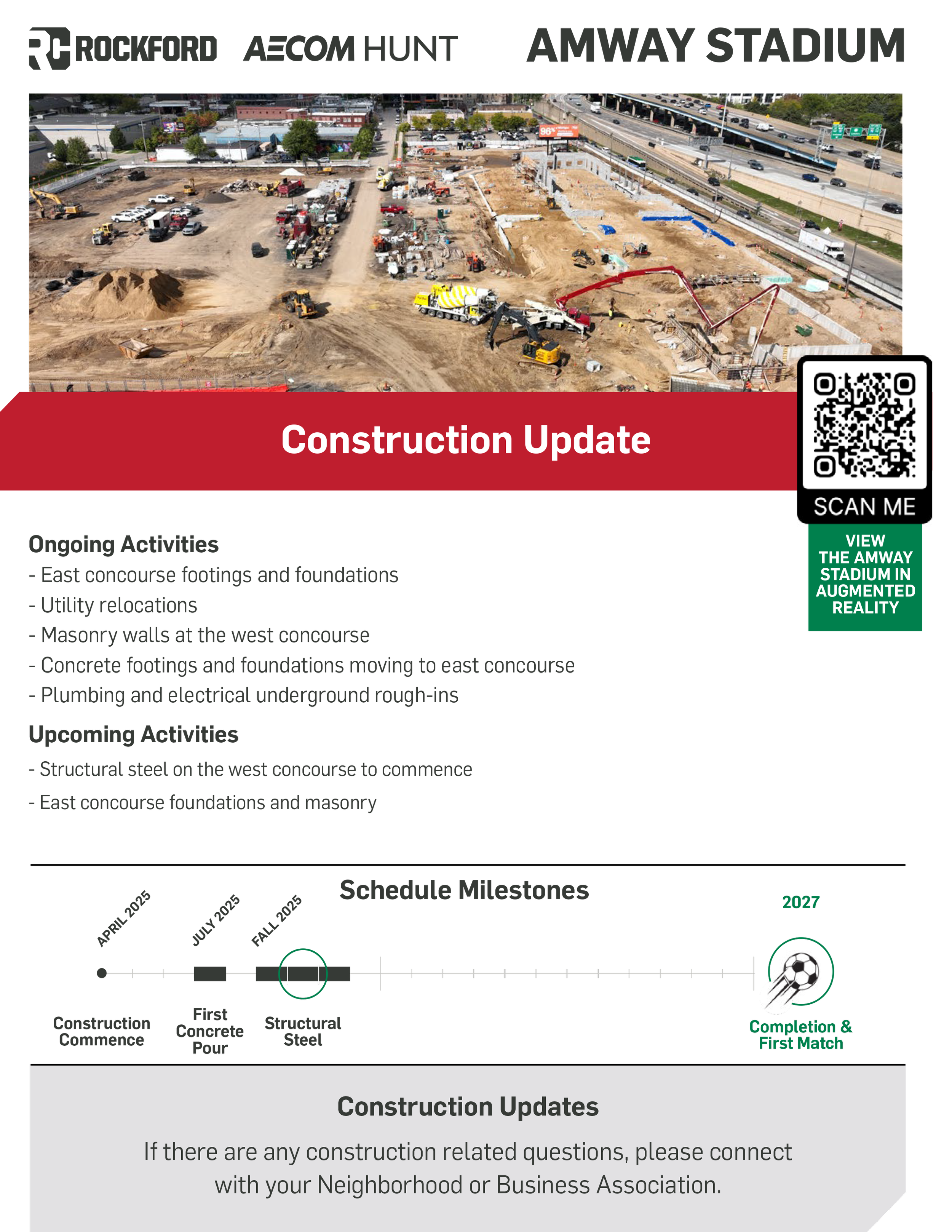 Rockford Construction has sent a construction update on the Amway Soccer Stadium to share with neighbors.