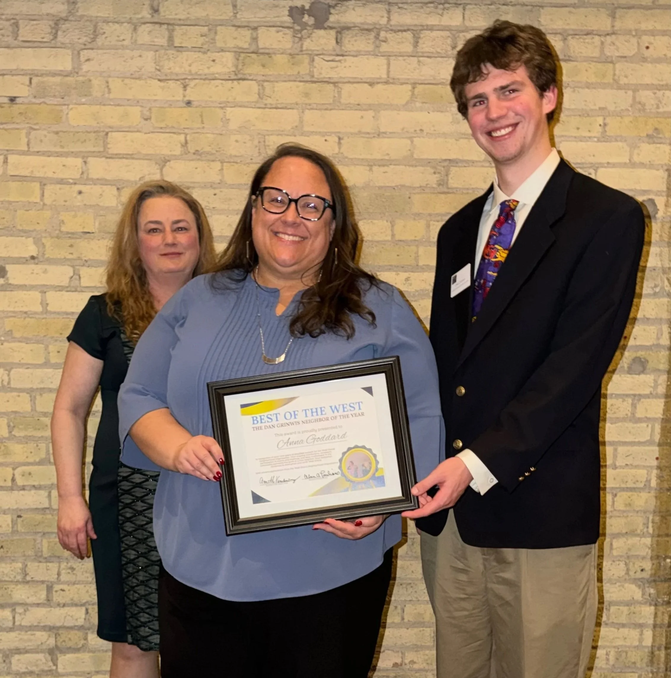 Anna Goddard receiving the Dan Grinwis Neighbor of the Year Award